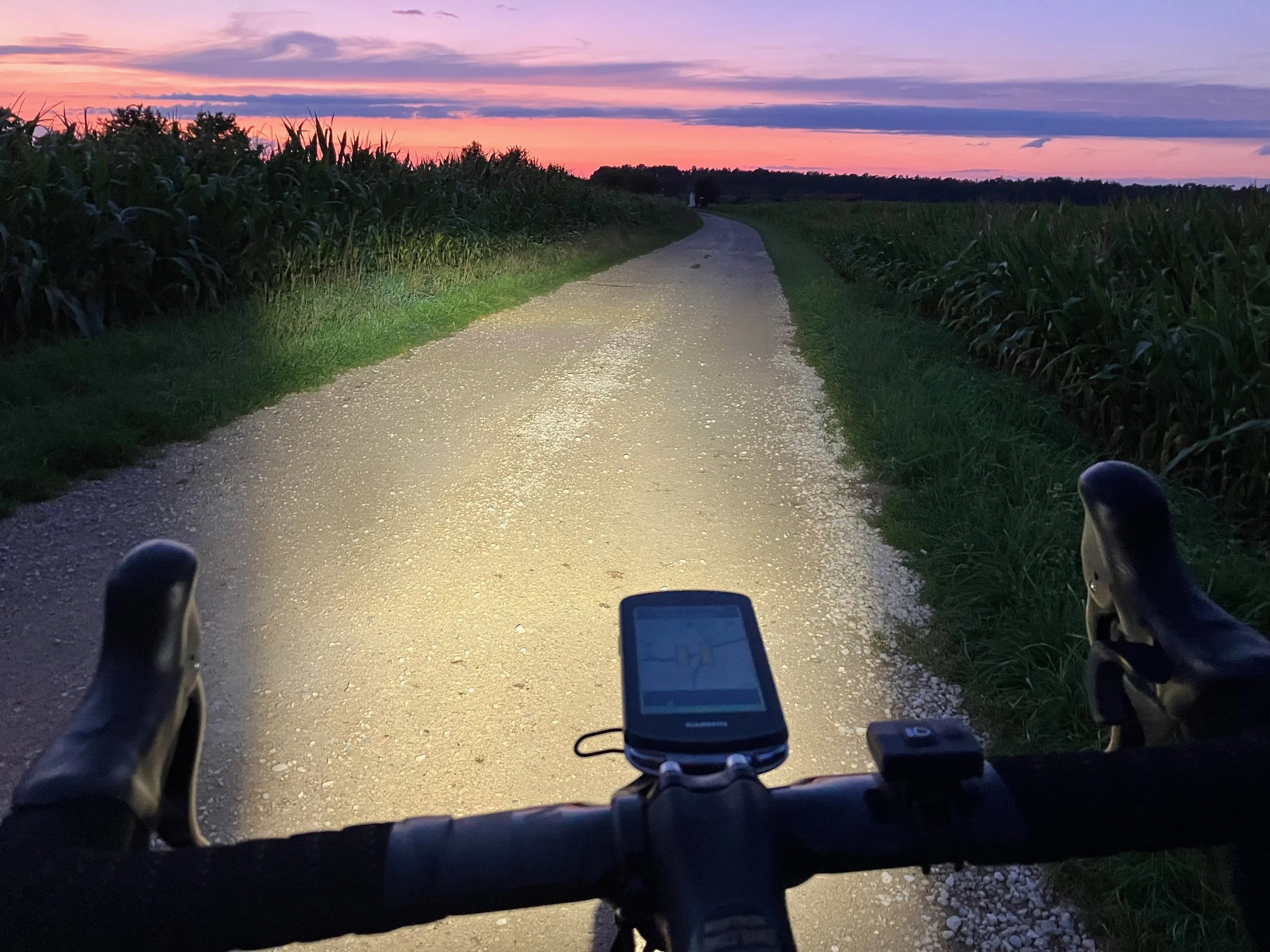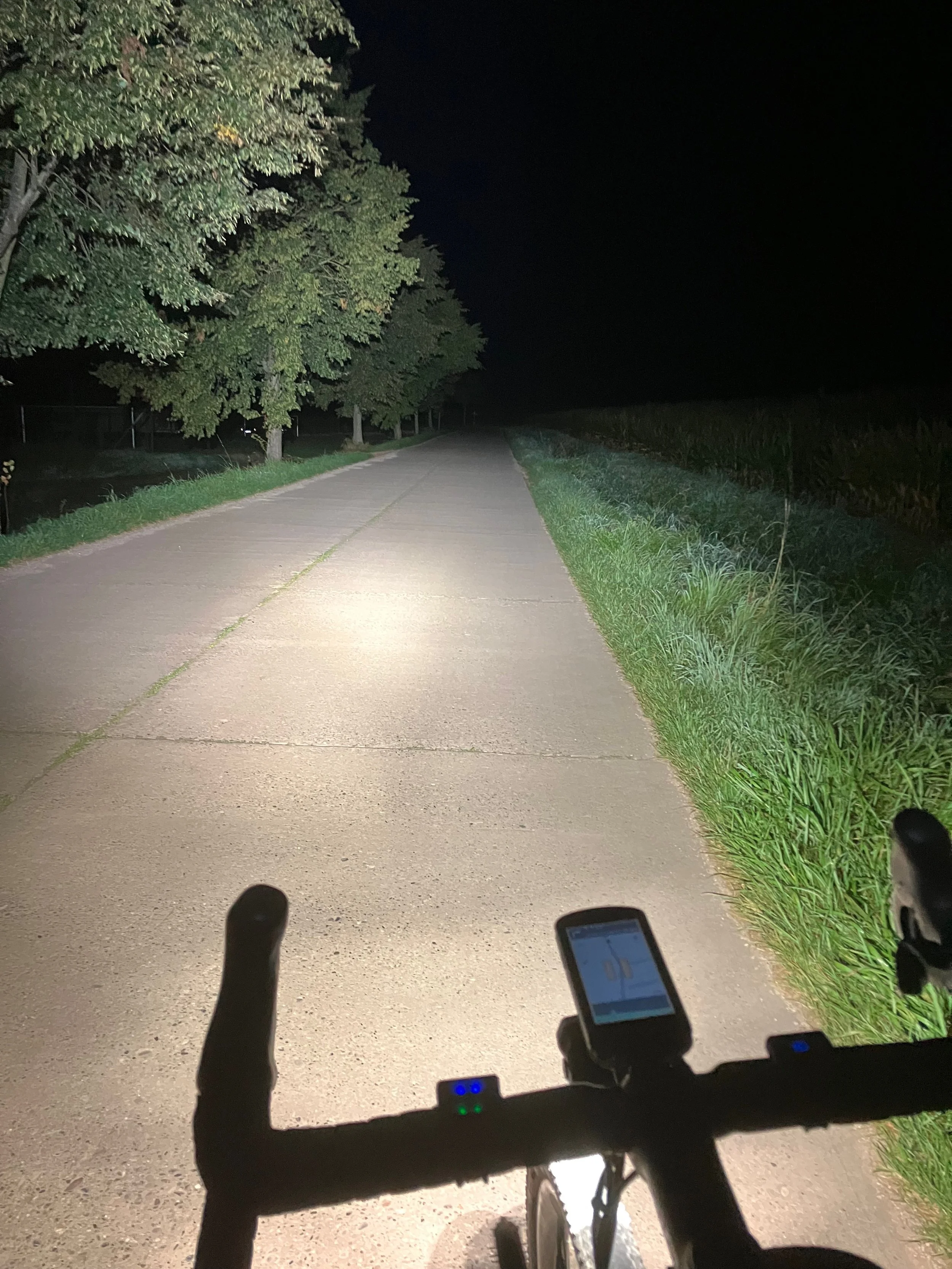 I use a front light that I can connect via action camera connection below my computer mount. I would recommend to have a broad front light. In really dark situations like in forests or farm roads you quickly run into the problem that you cannot see the turns. A broader light teppich helps a lot to navigate easily even in pitch black nights. Also I really like the functionality of having a distance light and a down beam.